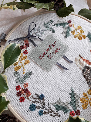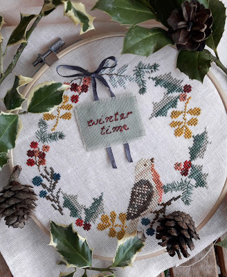 Ci sono momenti in cui si ricama per il solo piacere di farlo, senza scopo, senza progetti, in tutta lentezza, con dolcezza...ecco, questa ghirlanda è nata così. L'ho vista su Pinterest, vorrei citare l'autore dello schema ma non compariva, mi è piaciuta all'istante, con i suoi colori polverosi e invernali, ho scelto fra le tinte meravigliose dei mouliné di The Gentle Art, con calma e con cura...