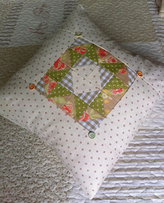 Un po' diverso per via del tessuto e del blocco patchwork che lo compone, ma con gli stessi colori, tenui che si richiamano alla campagna....
